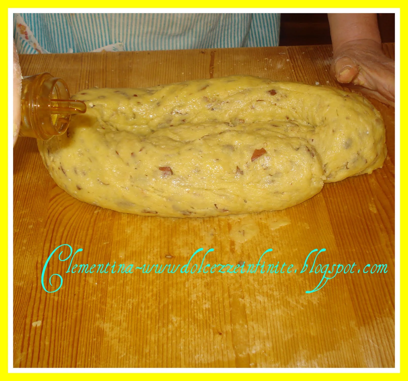 Setacciate la farina e disponetela a fontana sulla spianatoia. Aggiungete le mandorle e il resto degli ingredienti: lo zucchero, la vanillina, il lievito setacciato, il limone grattugiato, l'uva passa, le uova, l'olio extravergine di oliva, il latte.